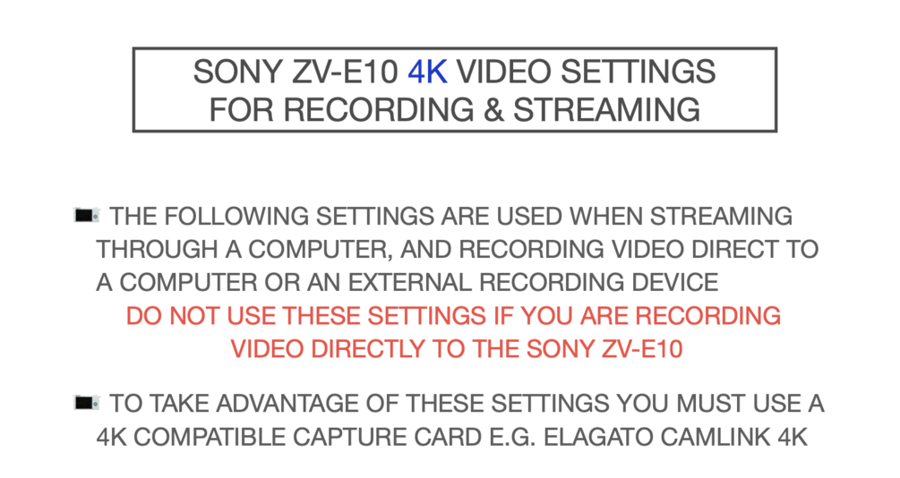 If you're looking to take advantage of the full 4K potential of the Sony ZV-E10 camera when video recording to an external drive, computer or Mac, or when live streaming, you need to make sure that the settings are correct. In this pdf I share my preferred settings which include the 4K HDMI only mode, with CleanImage Zoom and USB power.
